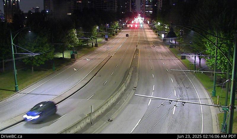 This camera provides a cityside perspective from the heart of downtown Vancouver. Located just west of the business district, it looks south along Georgia Street at Chilco, offering a snapshot of pre-bridge traffic and pedestrian activity. This is the final surface-street corridor before entering Stanley Park and approaching the Lions Gate Causeway. Heavy congestion here typically reflects downstream backups leading to the bridge entrance.