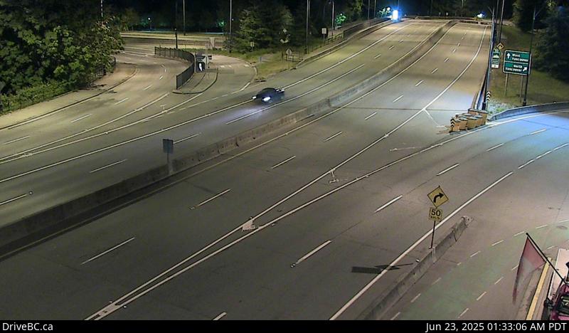 This camera captures traffic exiting the bridge toward North and West Vancouver. Located near the Capilano Road merge and the upper end of the bridge span, it offers a look at both outbound traffic dispersal and inbound congestion creeping northward. Viewers can also gauge conditions on the complex loop ramp system that connects to Marine Drive and Highway 1.