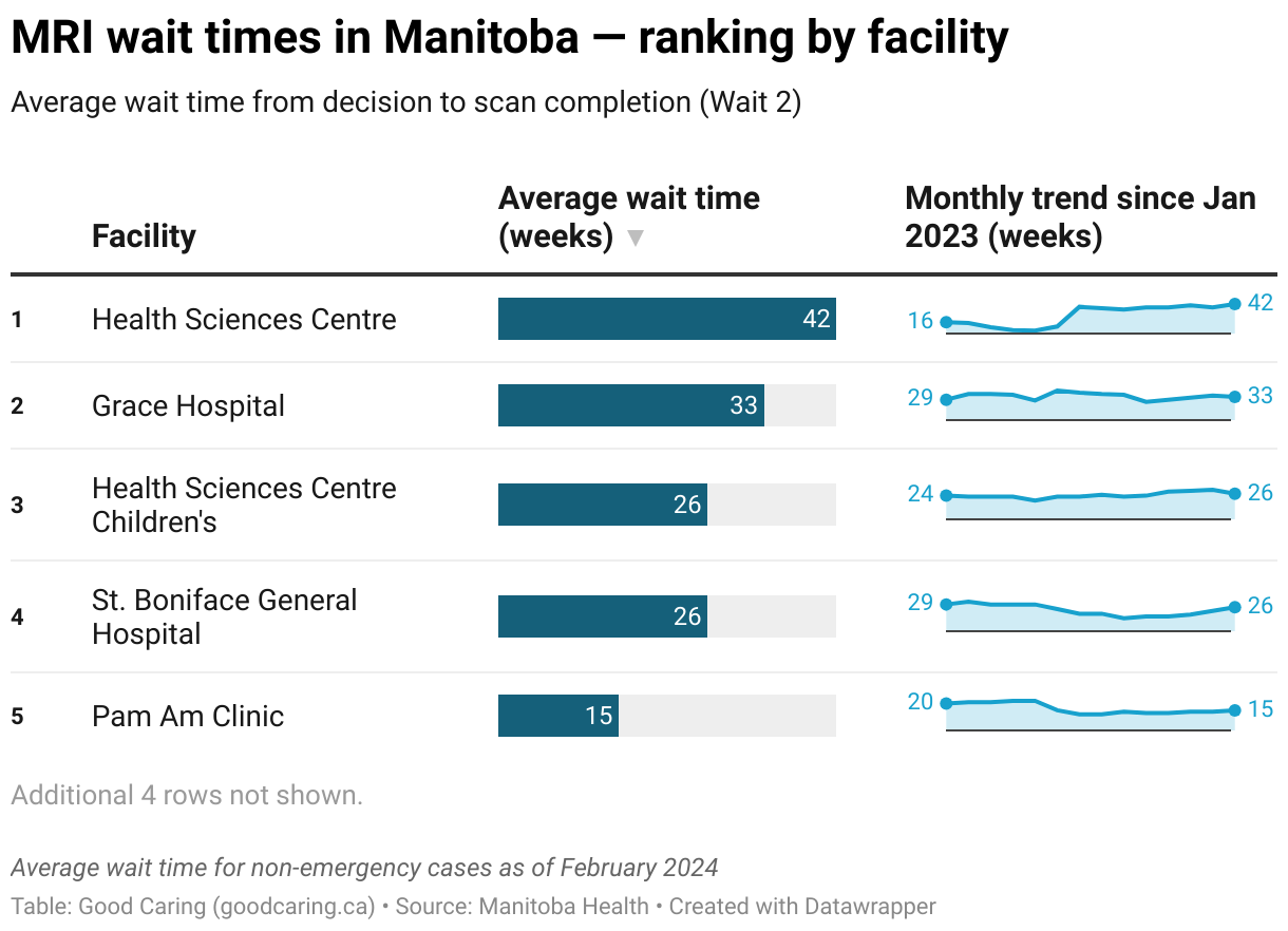 - St. Boniface General Hospital ranks fourth for the longest wait times, reporting an average wait of 26 weeks for MRI.