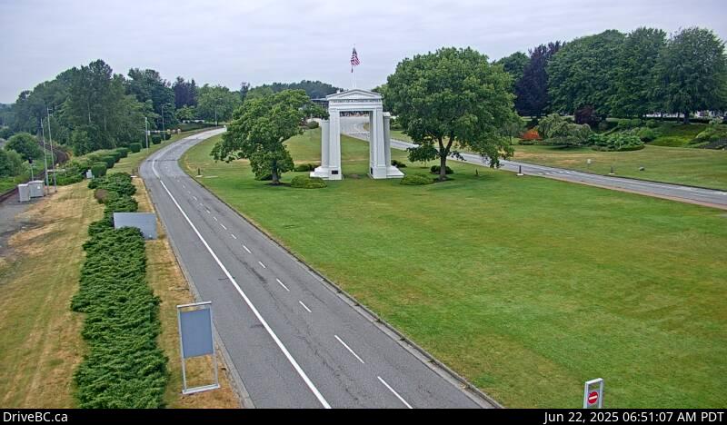 The camera at Peace Arch captures Highway 99 at the international border, facing north toward the Canadian inspection booths. This is the final checkpoint for drivers arriving from the United States via Interstate 5.