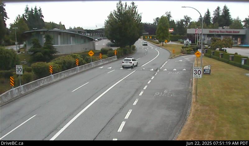 Facing south, this view shows Highway 99 traffic heading toward the Peace Arch crossing. The image helps gauge border wait times and general conditions on the final stretch toward the United States.