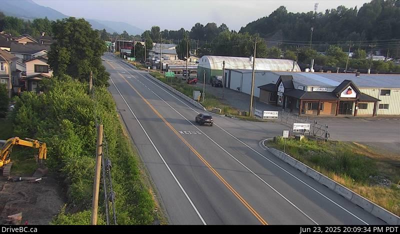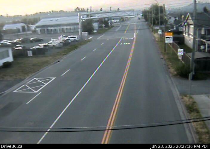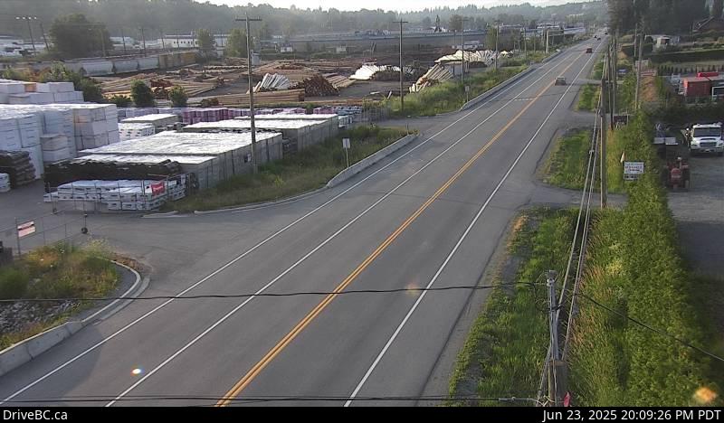 Looking north from the same intersection, this view shows a wide stretch of Highway 11 moving away from the Sumas border. The image includes a backdrop of sawmills and large stacks of lumber, offering a real-time look at post-crossing traffic dispersal through the southern end of Abbotsford’s industrial corridor.